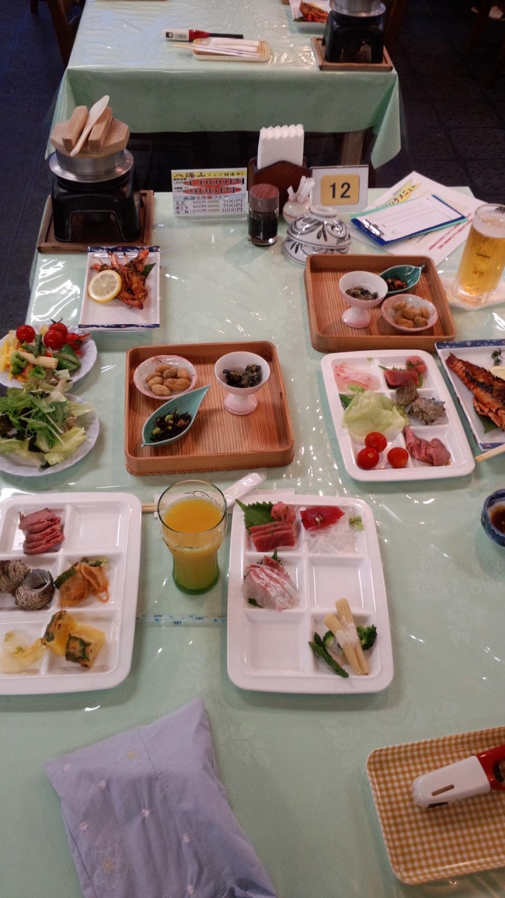 食事は朝夕とも満足です。生野菜が豊富。夜、1尾据え膳でついていた焼きイセエビ