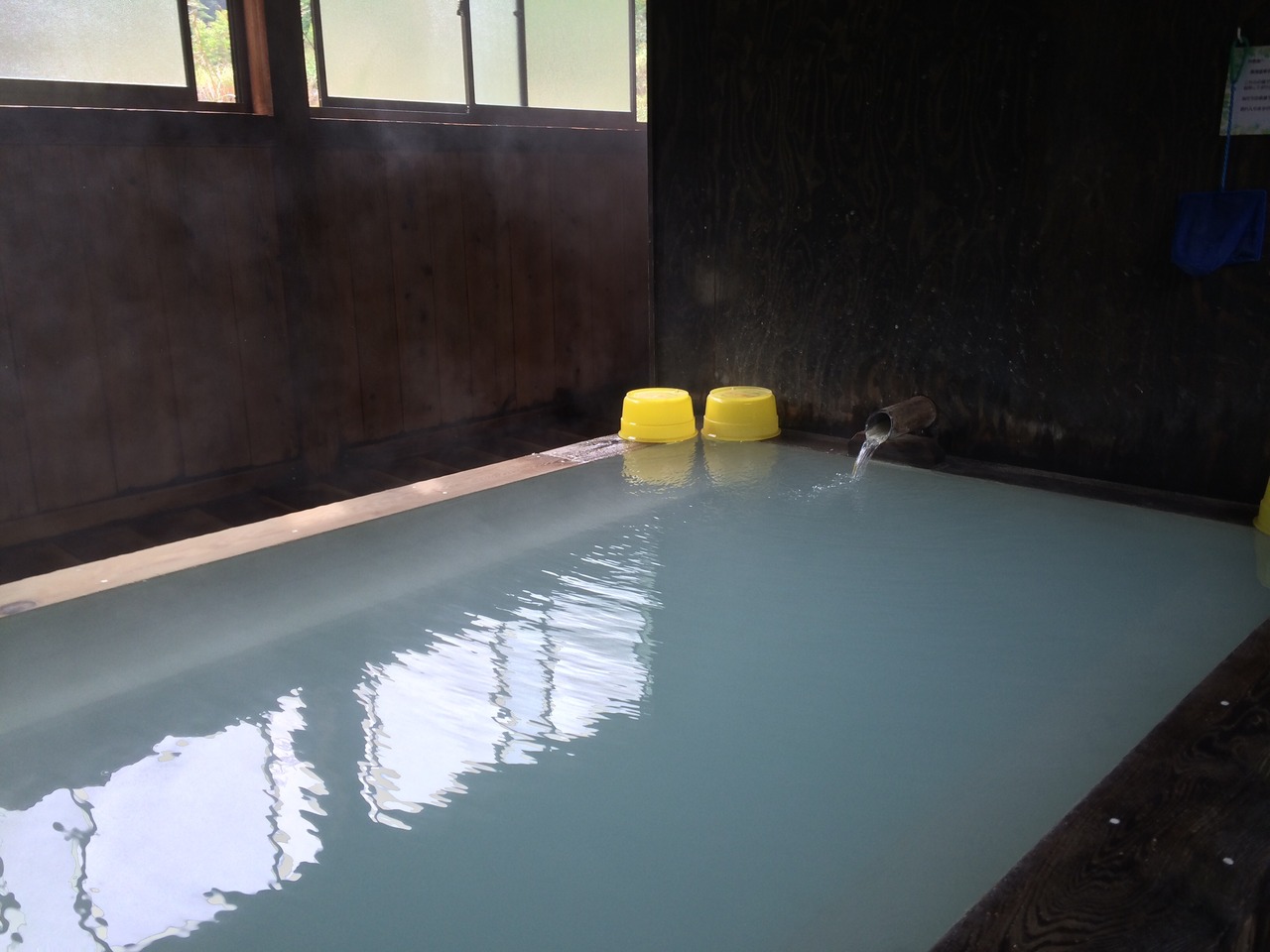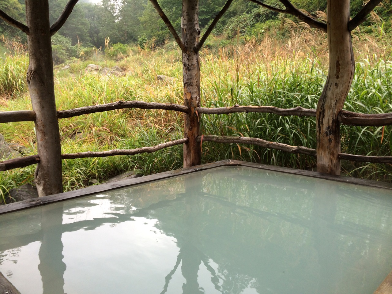 温泉は混浴と男女別とありました。混浴は露天風呂と内湯とかけ湯がありました。周りの景色も良く、自然の中でゆったりと温泉が楽しめました。乳白色の硫黄泉で、温度も適温です。9月初旬の涼しい風を受けながらの湯浴みは気持ちよかったです。