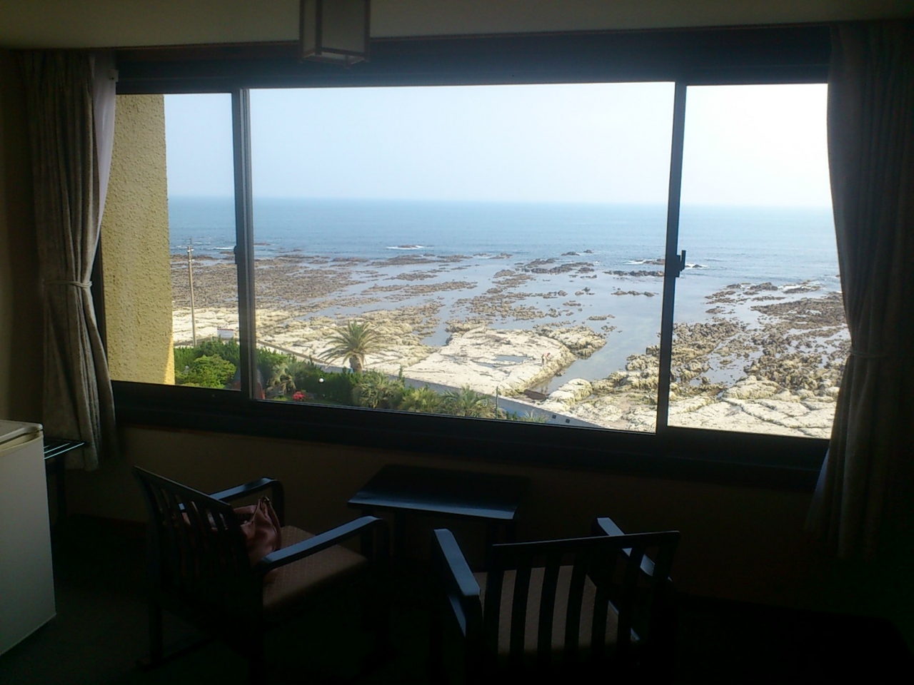 海沿いにある宿でとにかく見晴らしがいい宿でした。空の間(5F)なので海が見えるのは当然なんですが、水平線で部屋の名前通りそらが一面に広がって見える感じで、ガラス面が広いので部屋と一体化したような感じのへやでした。
