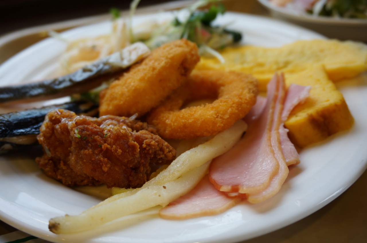 無料朝食はバイキング形式の和洋食。内容は写真の通りです。唐揚げやイカリングフライ、コロッケなどがあるのが何気に嬉しいわぁ。とにかく、まぁ無料だからと仕方ないか…と思わせず、種類が豊富で朝からガッツリ頂けるのが嬉しいですよね♪つい食べ過ぎちゃうのが玉に瑕ですが(>_<)