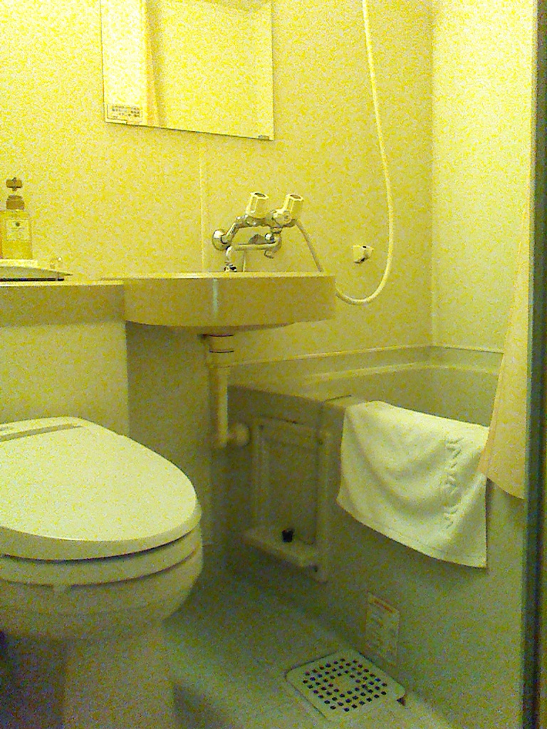 ユニットバスでどことなく薄汚れていますが、古いだけで掃除は綺麗にされています。ウォッシュレットのノズルも綺麗です。しっかりしたスタッフがいるのがわかります。ただ、ちょっと斜めに便器が設置されているのでペーパーを取る時体を捻ります。
