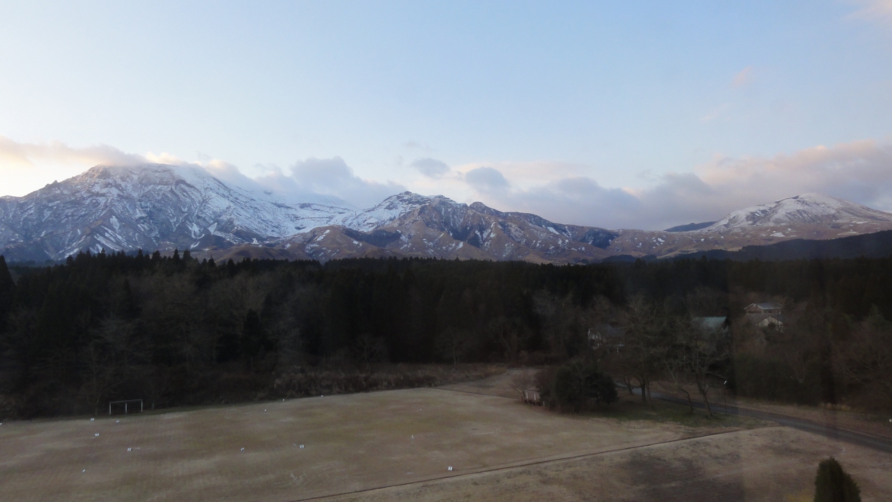 日が暮れてから到着したので、その日は窓からの景色は見ることができませんでした。部屋が阿蘇の山並みが見える側。朝起きてカーテンを開けると、冠雪した阿蘇5岳の姿がパノラマのように広がりました。その雄大な景色にしばらく見とれました。従業員の方は皆親切でした。