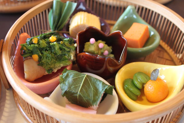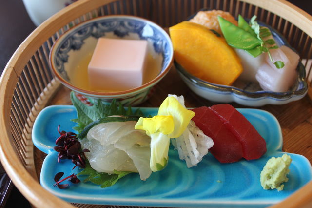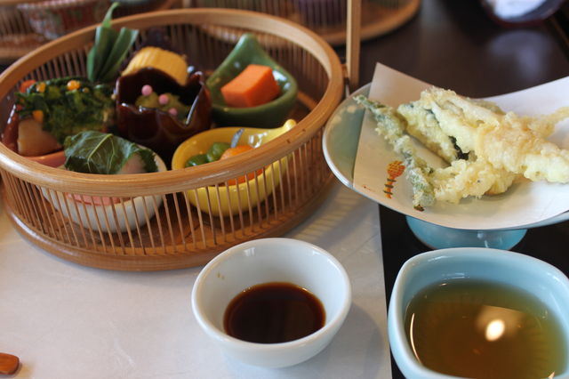 かわいいかごに入ったお料理や、揚げたての天ぷらなど、繊細で美味しい和食でした。