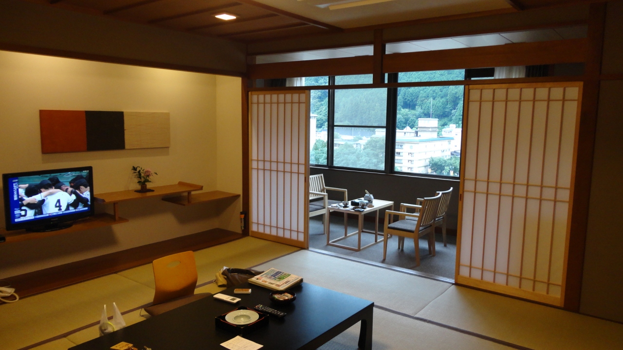 何を重視するかにもよりますが、立地は下呂温泉のど真ん中。昼や夜の温泉街を歩くならとても便利なところにあります。今回は夏の土曜日に開催される「下呂温泉いでゆ夜市」の日に合わせて行きました。部屋はリニューアルしてまだあまり経っていない、景観荘川側の12畳です。広縁も4畳ほどあり、とても広々した部屋でした。部屋付きの浴室、洗面、トイレなどの水回りはリニューアルされていませんが、清潔だったので特に問題なし。ただ川に面した大きな窓には、白い手形が無数に…コワイ。フロントに連絡して窓を拭いてもらいました。夕食はよくある会席料理でしたが、まぁ特によくもなく悪くもなくといったところでしょうか。ひとつ言わせてもらえれば次の料理が出てくるのがとても遅く、このことについてはいろいろな口コミで以前から書かれていますが未だ改善無しのようです。部屋、施設、パブリックスペースなどトータル的にはいいホテルだと思うので、是非改善できるところは改善してゆく努力をお願いします。また泊まりに行きますね。