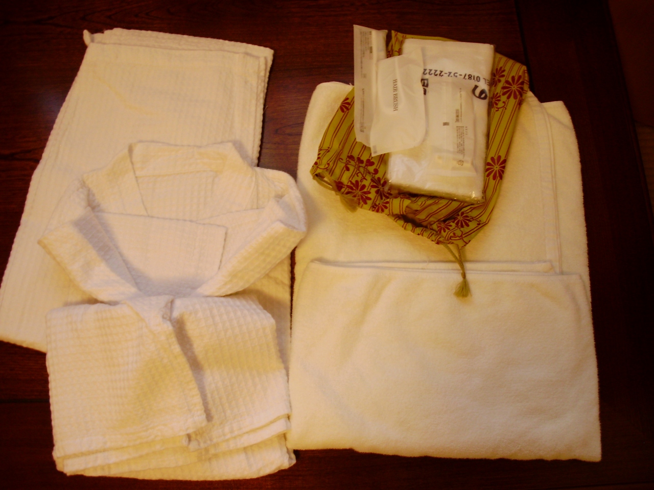 備え付けの作務衣を白いガーゼ地で作ったような浴衣が肌に気持ち良く着やすい。ただ、厚い生地ではないので風呂上りなど女性は肌がちょっと透けてしまうかもしれない。風呂に来ていくときは下着になるようなものが一枚必要である。