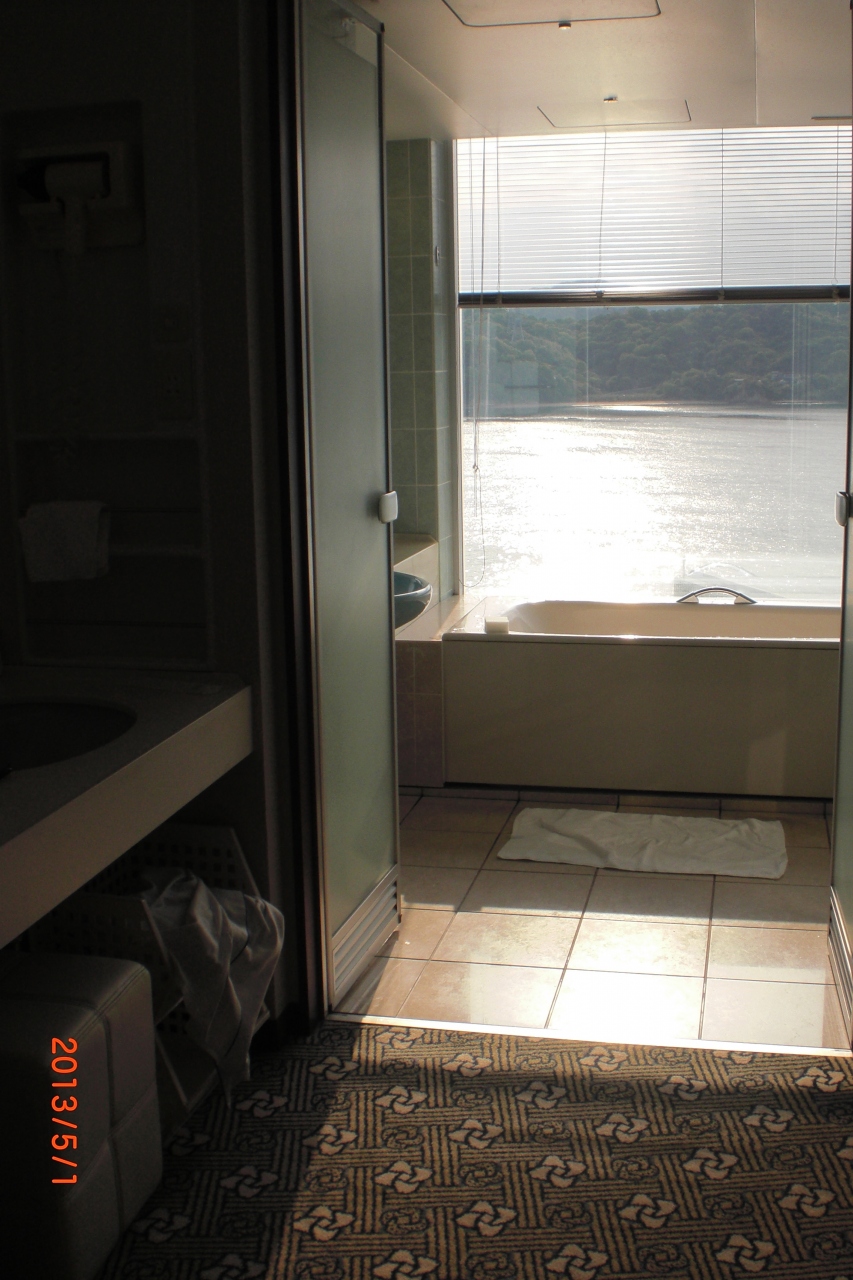まず部屋の扉を開けたら、右手に広い洗面台と脱衣所があります。その先にはオーシャンビューのバスタブ、さっきの通路に戻り、正面の扉を開けるとベットルームで、とても大きな窓から海が見渡せて最高の景色です。ベットが4つ入っても十分な広さです。
