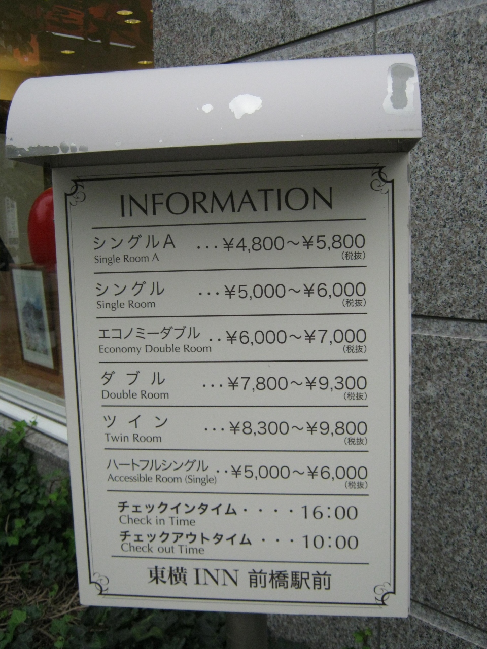 一覧を見る前橋駅南口を出てすぐのところにあり、1人で泊まって1泊5,400円程度でした。