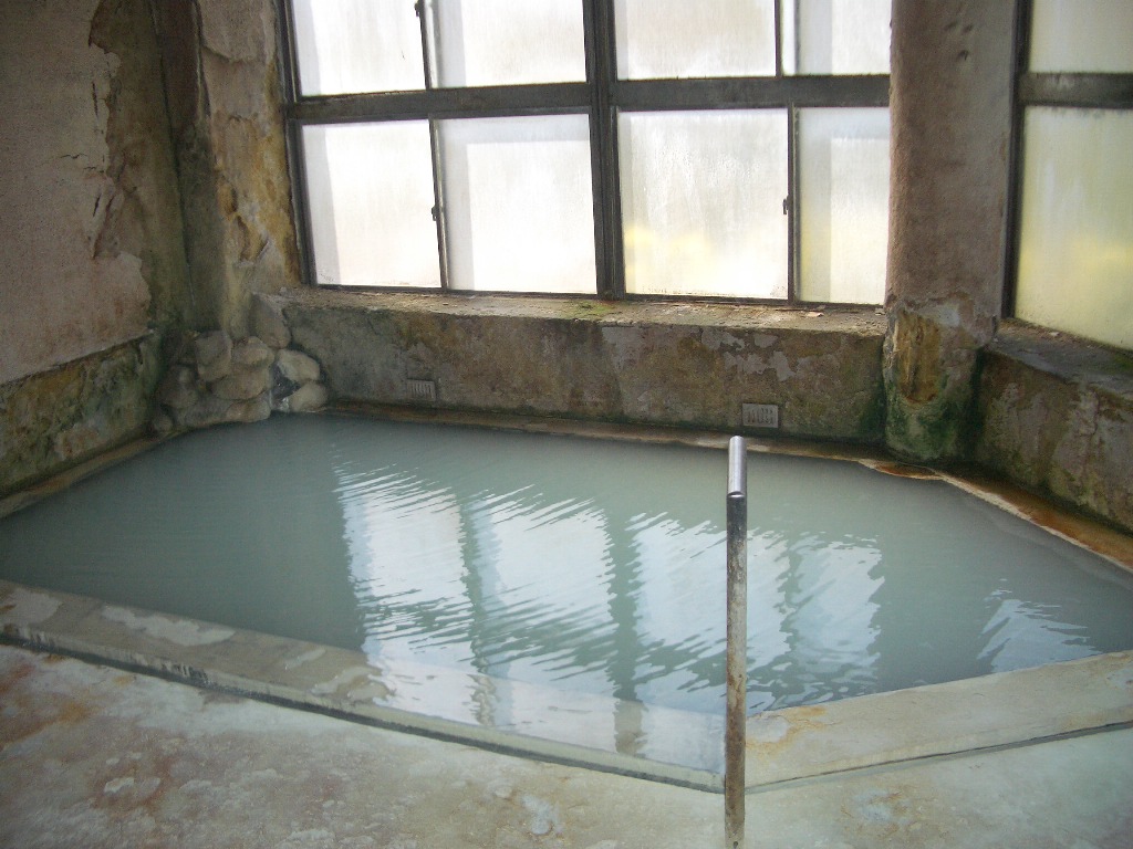 かなり年期の入った浴室。入ると硫黄の香りが強く、濃い成分のためか壁がボロボロで迫力あり。温泉マニアなら垂涎って感じです。