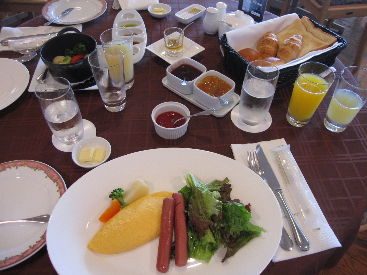部屋はデラックスツインの角部屋でした。着いたのは黄昏時で、部屋からは、夕陽を背に受ける富士山の美しいシルエットが見えました。朝は、モヤのかかった山あいの風景が眼下に広がり、一種幻想的な雰囲気でした。