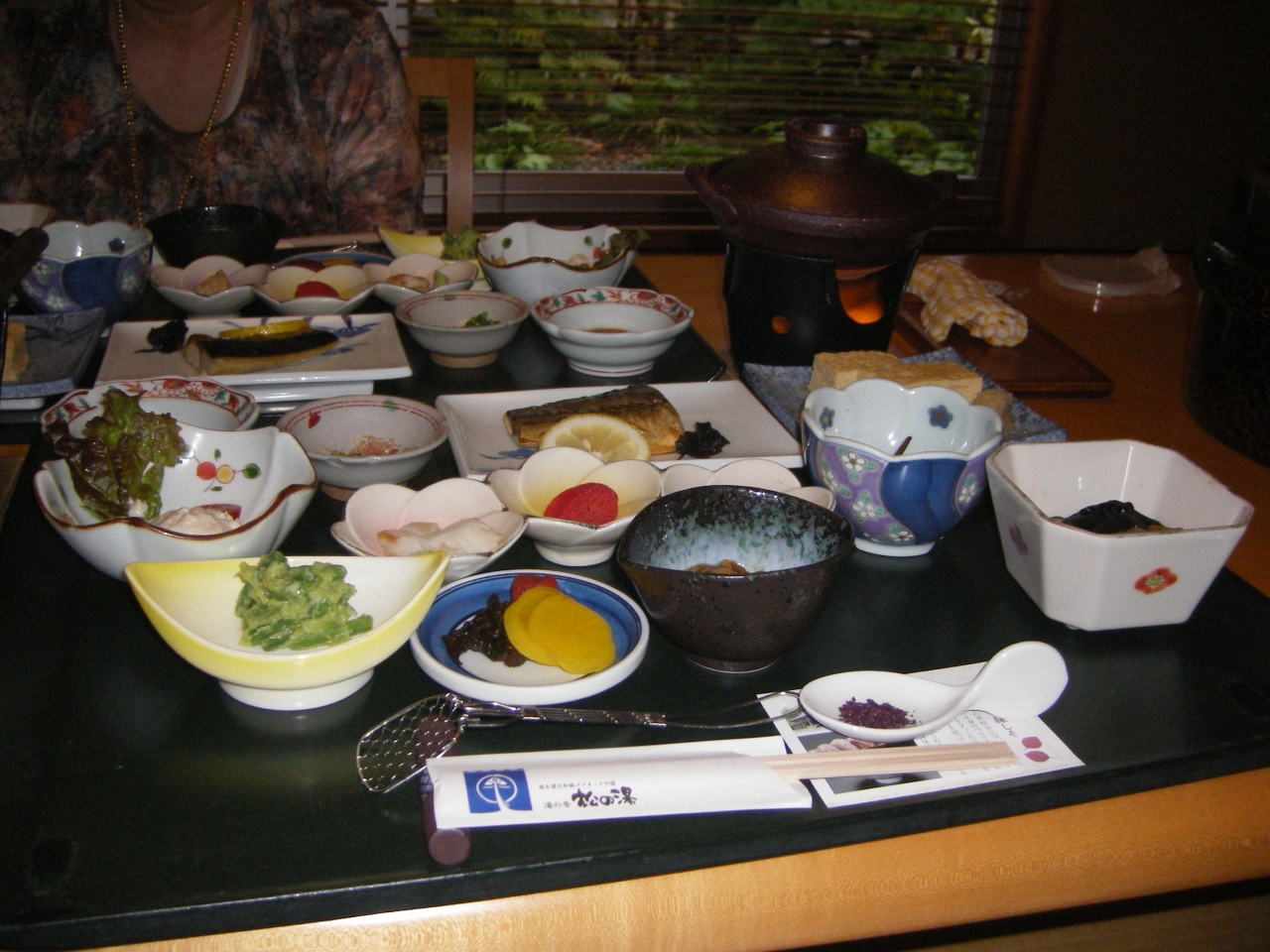 夕食は、見た目も鮮やかな「かご盛」を初め郷土料理の芋煮、ステーキ、そば、その他趣向を凝らした焼物、煮物など大変豪華。食が細い方にはちょっと多いすぎるかもしれません。朝食もたっぷりで、しかも、ワンパターンの焼き魚、卵焼きなどではなく、丁寧に整えられたお膳という印象が持てました。