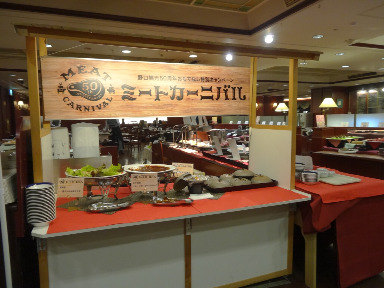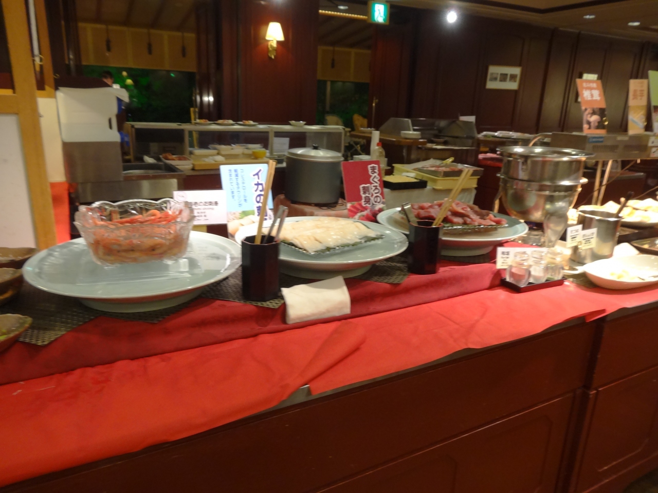 夕食のバイキングは2Fの会場で、寿司をにぎってもらったり、ステーキを焼いていたり、天ぷらをその場で上げていたりと内容はよかったです。デザートも充実していました。夕食時間が遅かったこともあり、あまり混雑もしていませんでした。