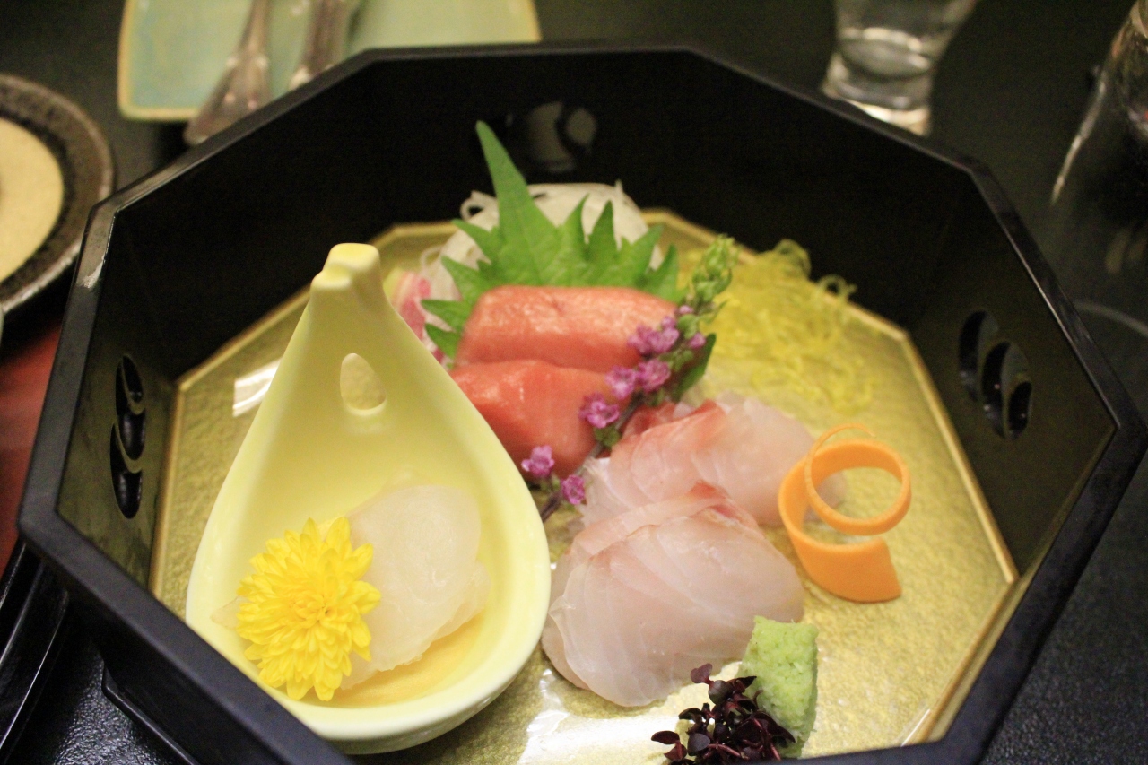 夕食では地元で取れた新鮮な魚介類を使った見た目も鮮やかな食事を楽しむことができました。