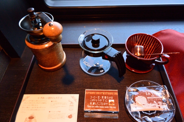 お部屋は、レトロな雰囲気なので薄暗さはあります。コーヒー豆やミルが用意され、自分で豆を挽いてコーヒーを飲めます。挽きたての豆で飲むコーヒーは香りが高く美味しかったです。