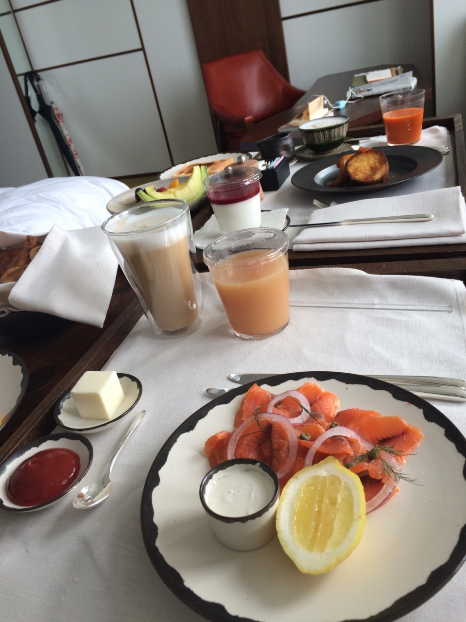- ルームサービスで朝食をいただきました。