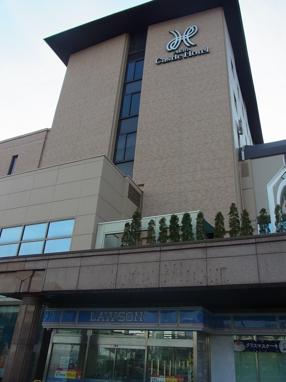 部屋は、比較的広くて寛げます。ホテルの脇にはコンビニがあり、なにかと重宝しました。すぐ横には、県立美術館。千秋公園や川反通り(繁華街)も徒歩圏内です。