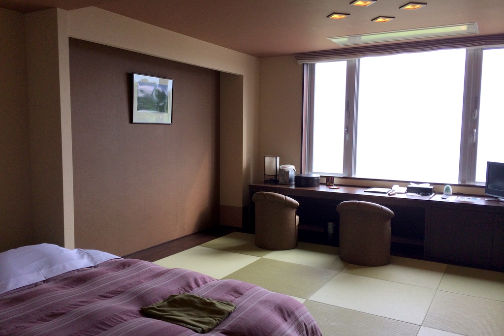 天気がよければ、部屋の窓から日本海に沈む夕陽が見渡せる温泉ホテル。和風ツインに泊まりましたが広く、施設も新しく快適でした。