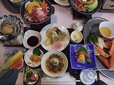 1人1泊2食7200円で「アワビ、ズワイガニ大皿盛、和牛プラン」で宿泊しました。デザートのフルーツも含めて全9品は、食べきれない量でした。しかも、タラバガニには、隠し包丁など一切なかったものですから、全部の身をほぐすのに20分以上かかってしまい、牛肉もアワビも火が通りすぎて、硬くなってしまいました。せめてカニに包丁を入れておいてくれると、もっと印象が良くなったんだけどな。