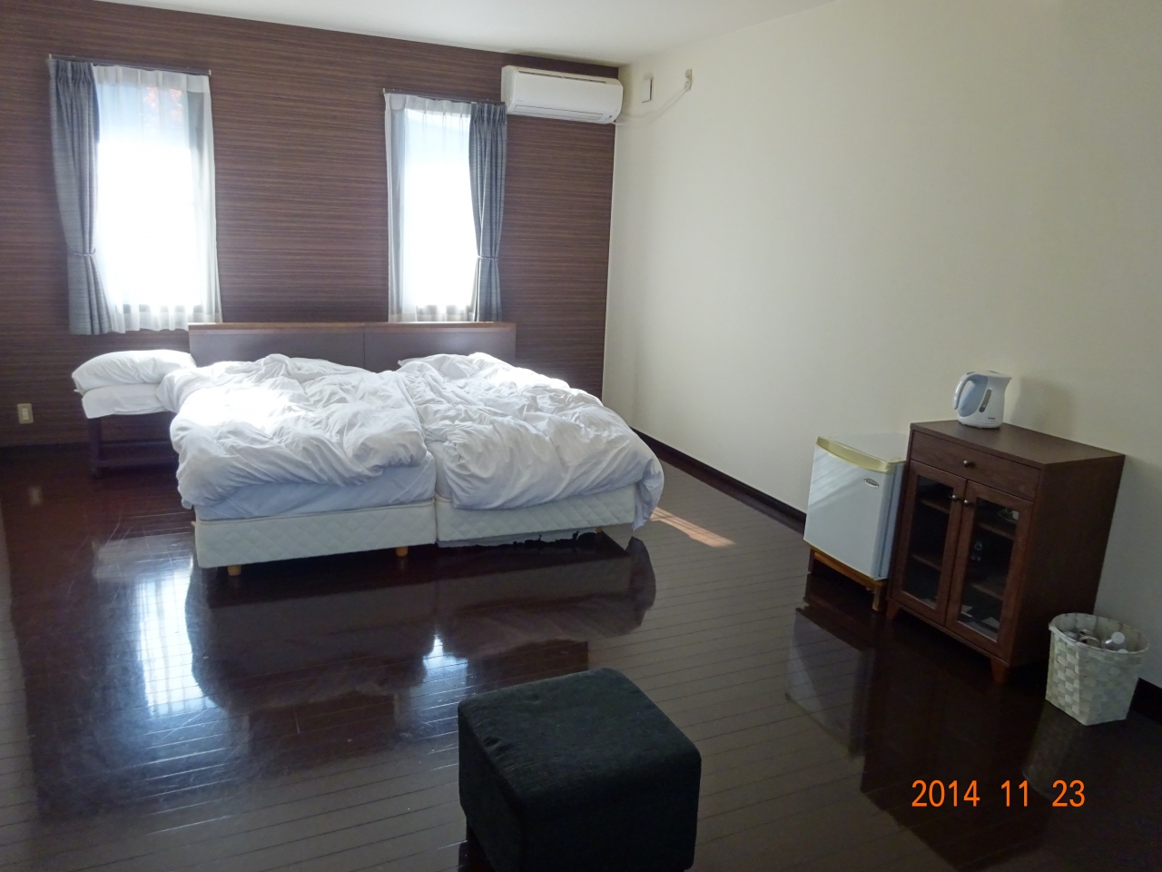 デザイナー設計の宿のようで、基本洋間です。部屋はフローリングで段差はありません。空間も広く感じます。部屋付き露天風呂が一面ガラス張りで見えます。ただ、ガラスは開きません。