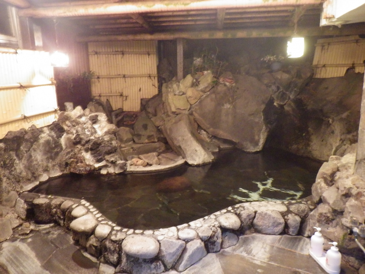 すべての風呂が貸切で利用でき、半露天の岩風呂が一番広くて気持ちいいです。