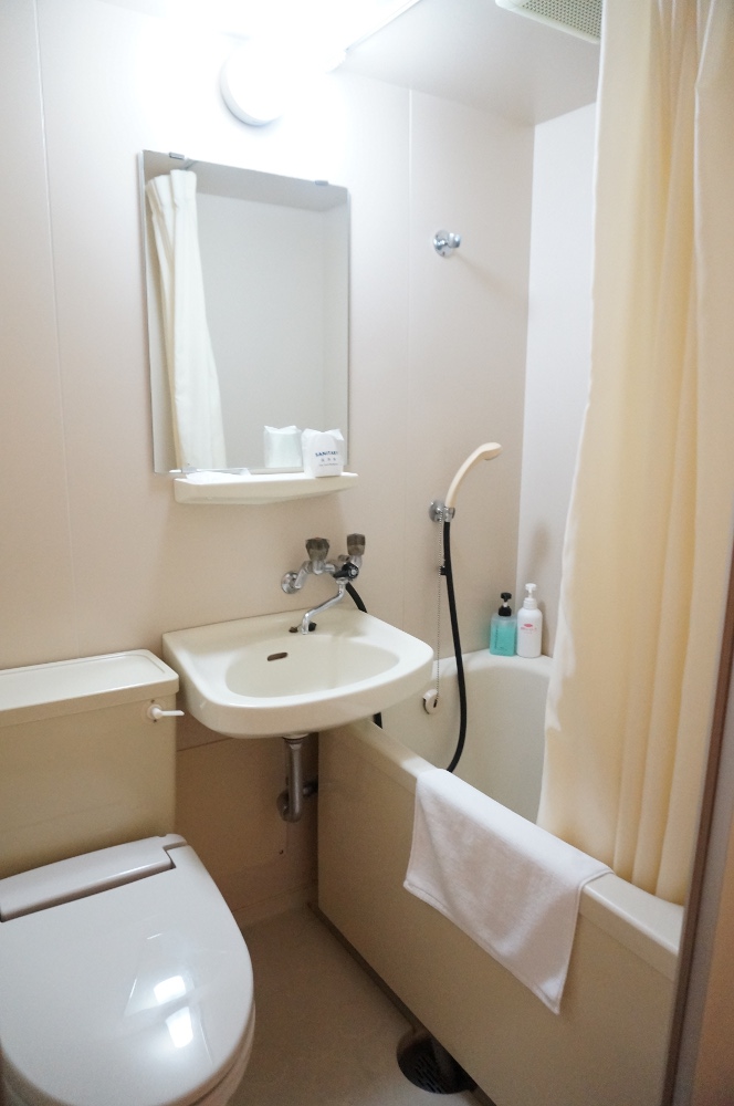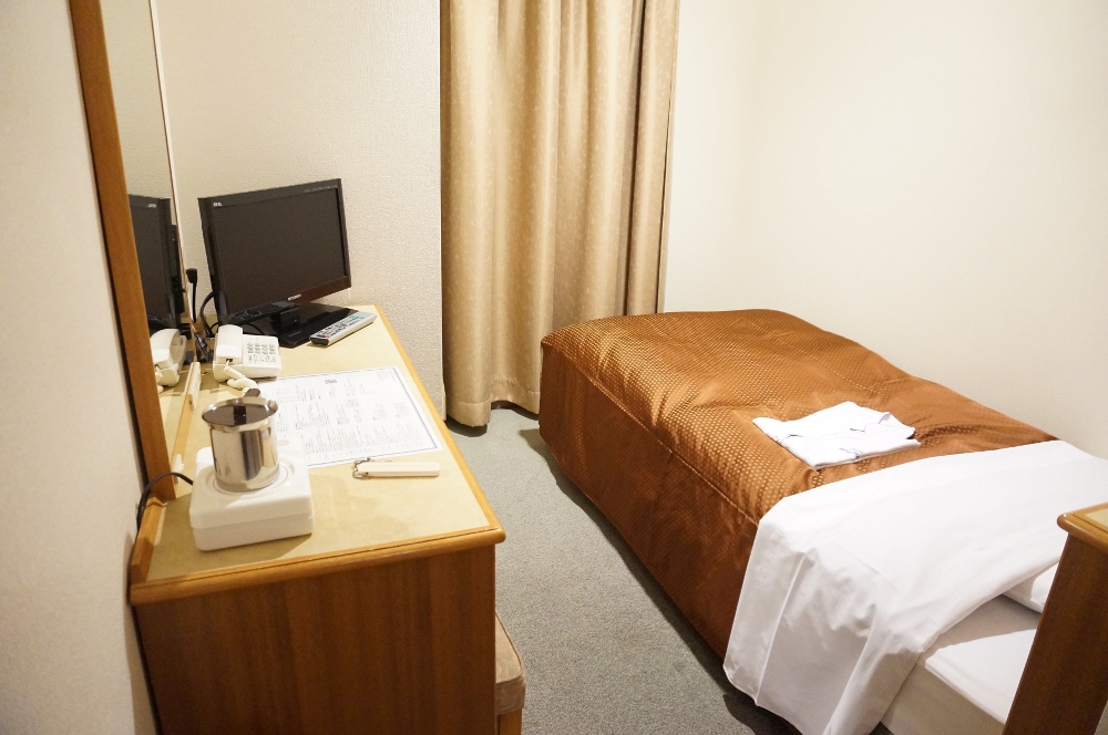部屋は一般的な、ビジネスホテルのシングルルームという感じの狭さですが、特に窮屈さを感じることはありませんでした。ヘアドライヤー、歯ブラシ、コーム、安全かみそりが常備されています。お湯も沸かせるので便利でした。但し、スリッパが使い捨てのものではなく、ビニル製のスリッパだったので、(綺麗にして下さっているとは思いますが)使用は躊躇いました。