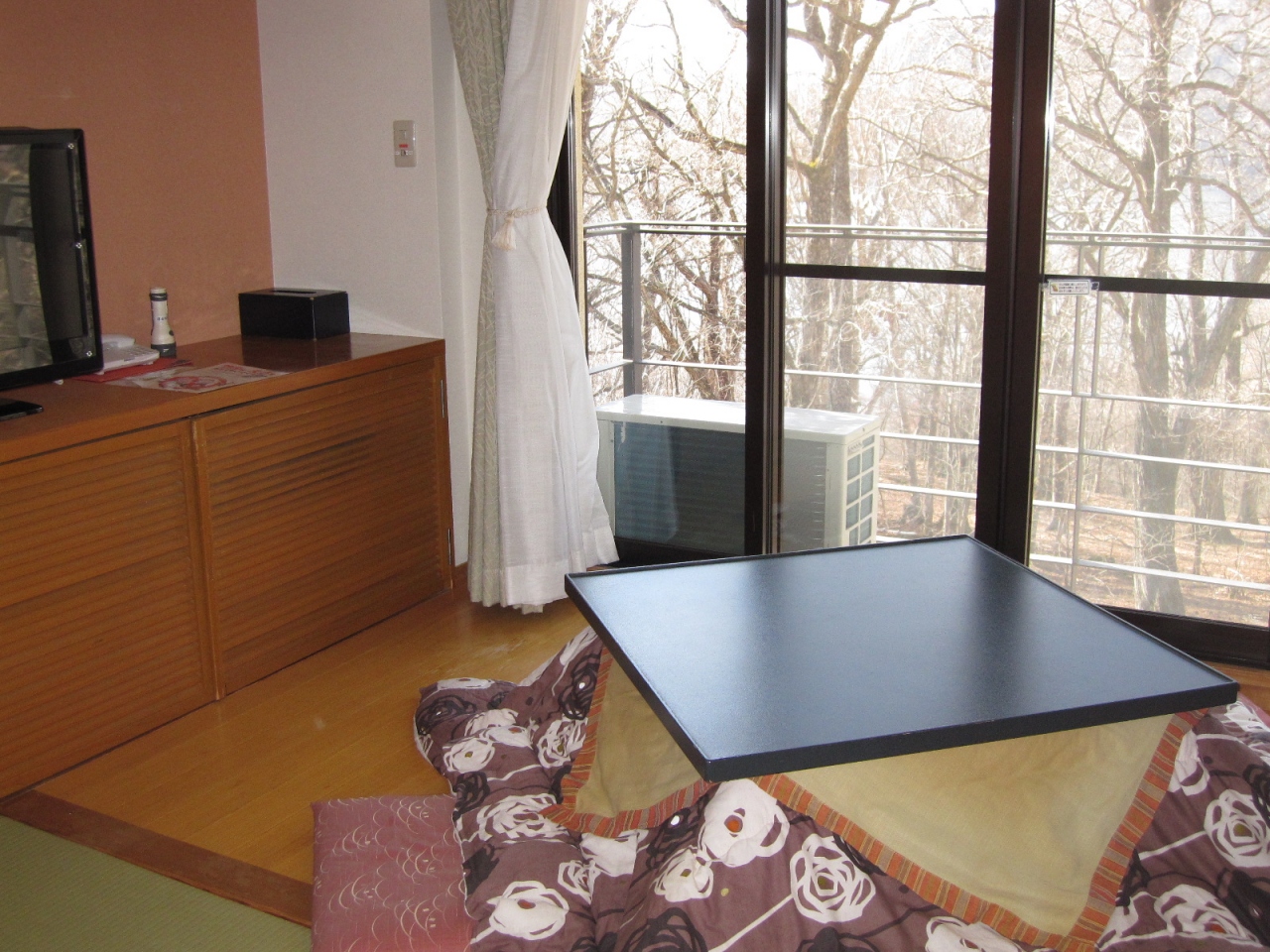 掘りごたつ付きの部屋に宿泊しました。目の前に木々がありますが、湖と対岸の山々も望めます。改装されているのだと思いますが、青い畳が気持ちいいです。