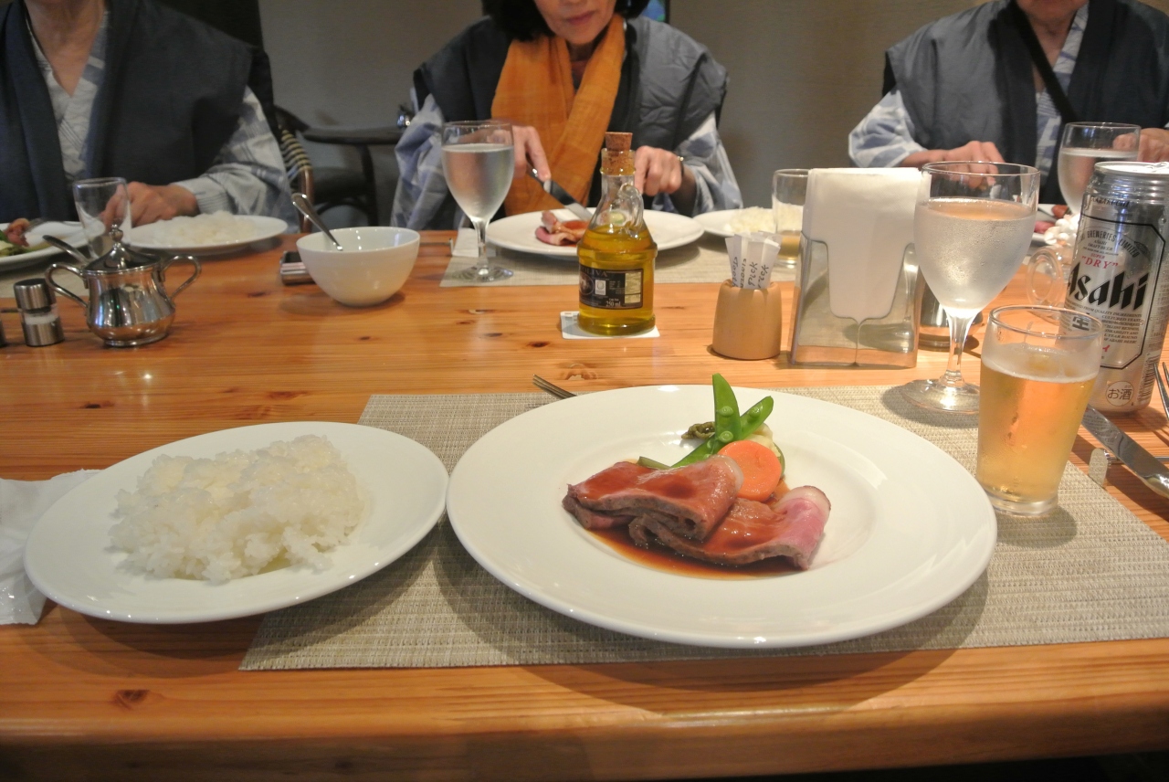公共の宿の良い所も悪い所もあります。料理はフランス料理風のコース料理。