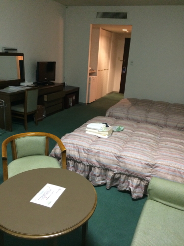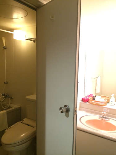 普通のツインルームにユニットバスと洗面所があるけれど、温泉大浴場があるので、ユニットバスを使うことはないので狭くても問題なし。