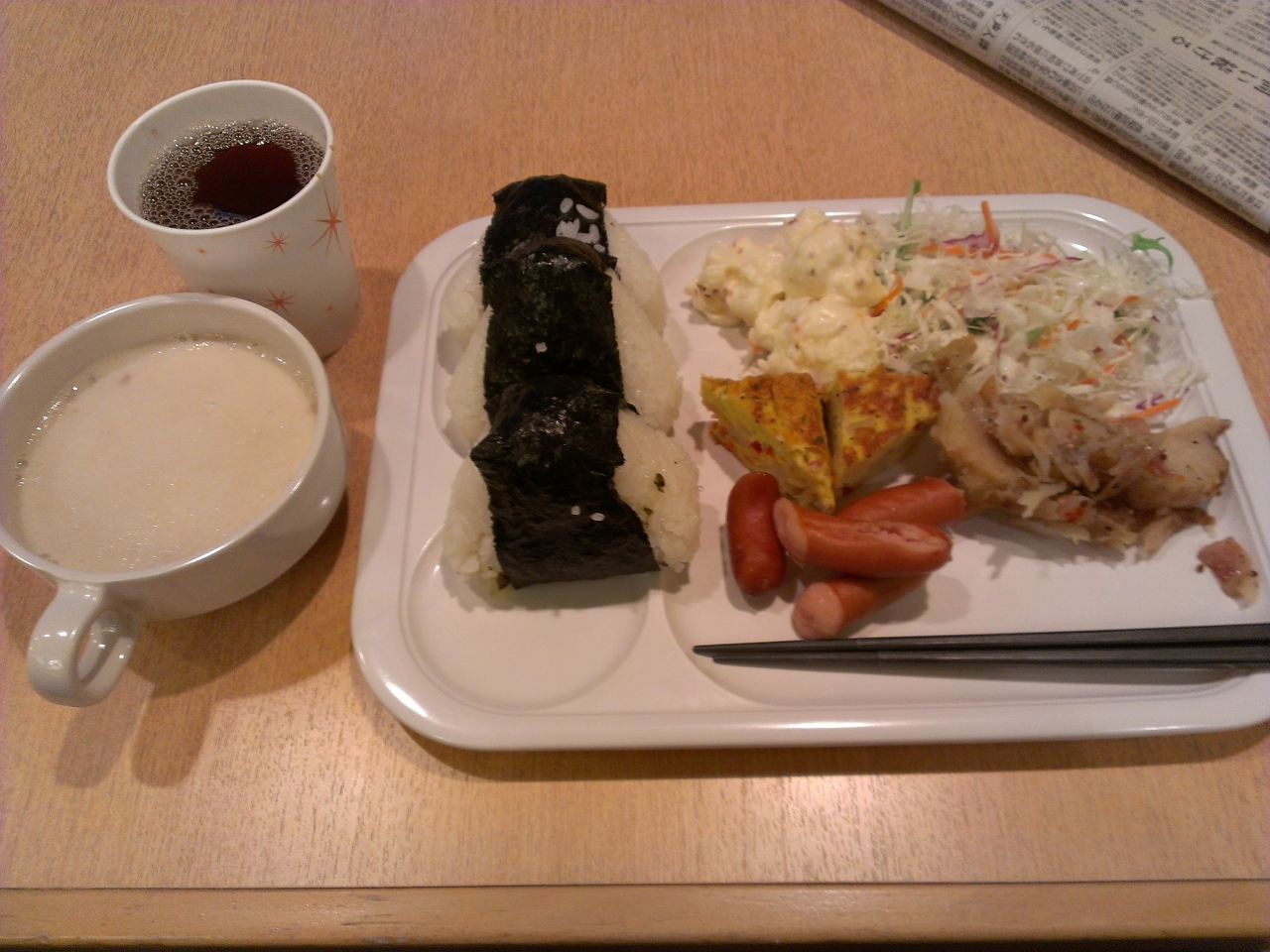 ただし、サービスはよく、コーヒー無料、朝刊(朝日)無料、客室に持ち込んでもよい。朝食もサービスで、ワッフルとかデニッシュとか、甘いもの系があるのはポイント高いところ。おにぎり、日替わりスープ、その他つけ合わせのお惣菜も意外と味はよい。着いてさえしまえばあとは気持ちよく過ごすことができる。宿に着いたら外には出たくない派にとってはよいところ。