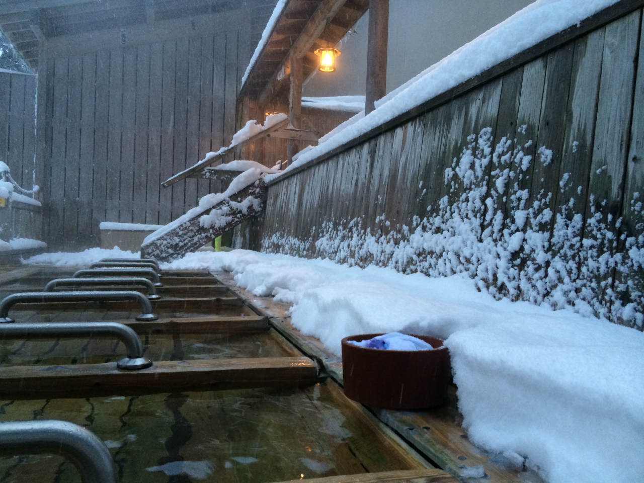 宿のお風呂は露天風呂の前(川側)に寝湯があります。寝湯で寝ころんで見る雪景色はとても素晴らしかったです。