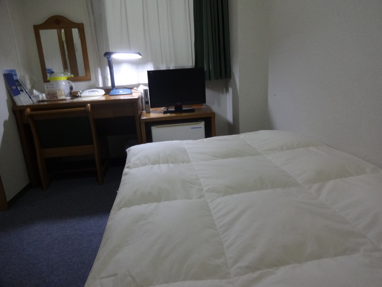 部屋はコンパクトにまとまっています。窓は曇りガラスなので景色は楽しめません。バスルームは洗い場とバスタブが分かれていて便利です。