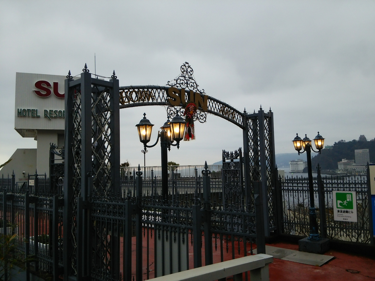 ホテルは海沿いの斜面にあるため、駅から歩いていくと屋上フロアから入ることになります。