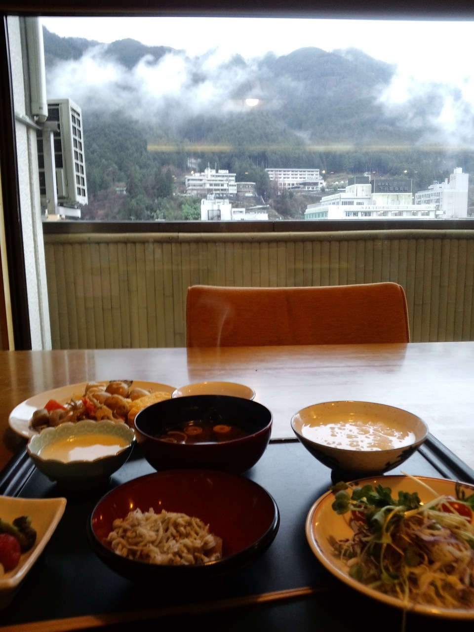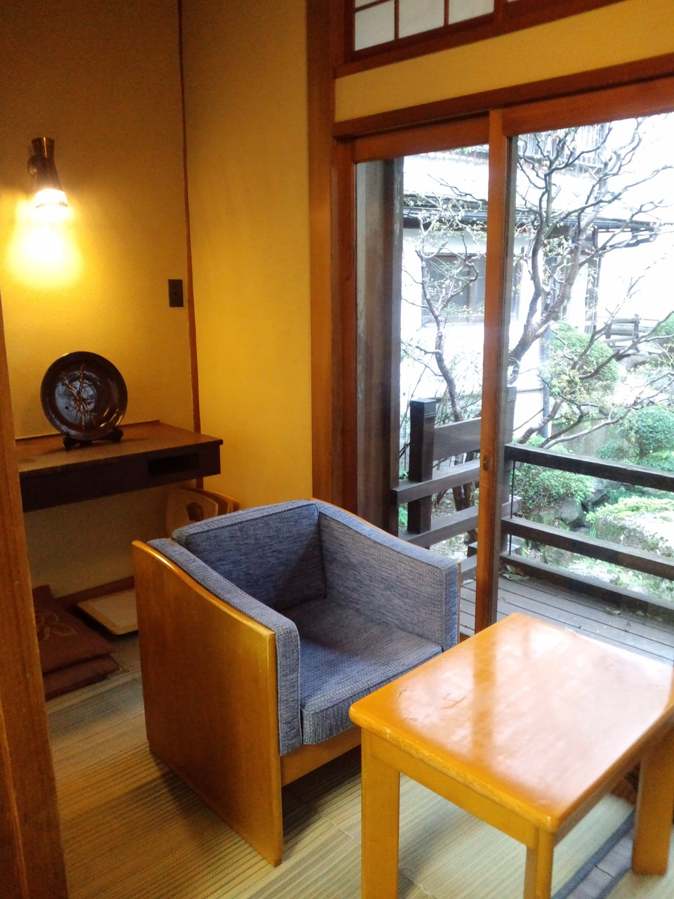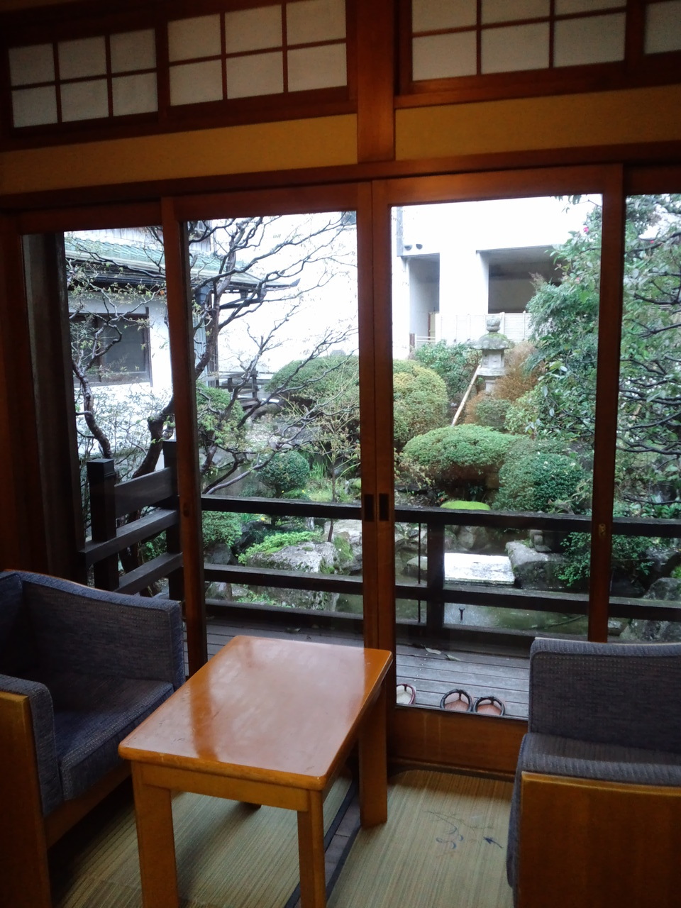 椅子に座って庭を眺めていたら、隣の部屋のお客さんも窓近くで何人かおしゃべりしだして、まるで同じ部屋にいるくらいにぎやかな声がよく聞こえるので、そっと退散して、障子戸を閉じました。窓がサッシではないせいでしょうか。