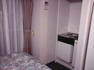 設備:ミニキッチン付。でもコンロはコンセントごと抜かれているらしい。冷蔵庫とポット、コップ類は付属。衣類消臭もあって便利。