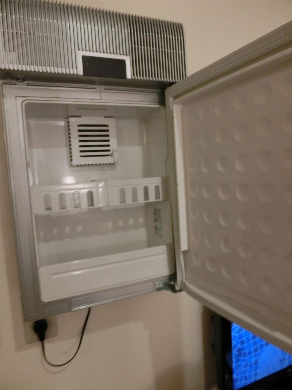 古さ(バスルームが全体的に黄ばんでいるのか、照明カバーが日焼けしてオレンジががっているのか…)・狭さ(もちろん海外に持っていくようなスーツケースは広げるのに一苦労。2名ですれ違うのも考えて動かなければ…)・冷蔵庫らしき小さいもの(500mlペットボトルが入るか危うく、あまり冷えない)・窓の結露をタオルで押さえている状況。と色々衝撃を受けました。