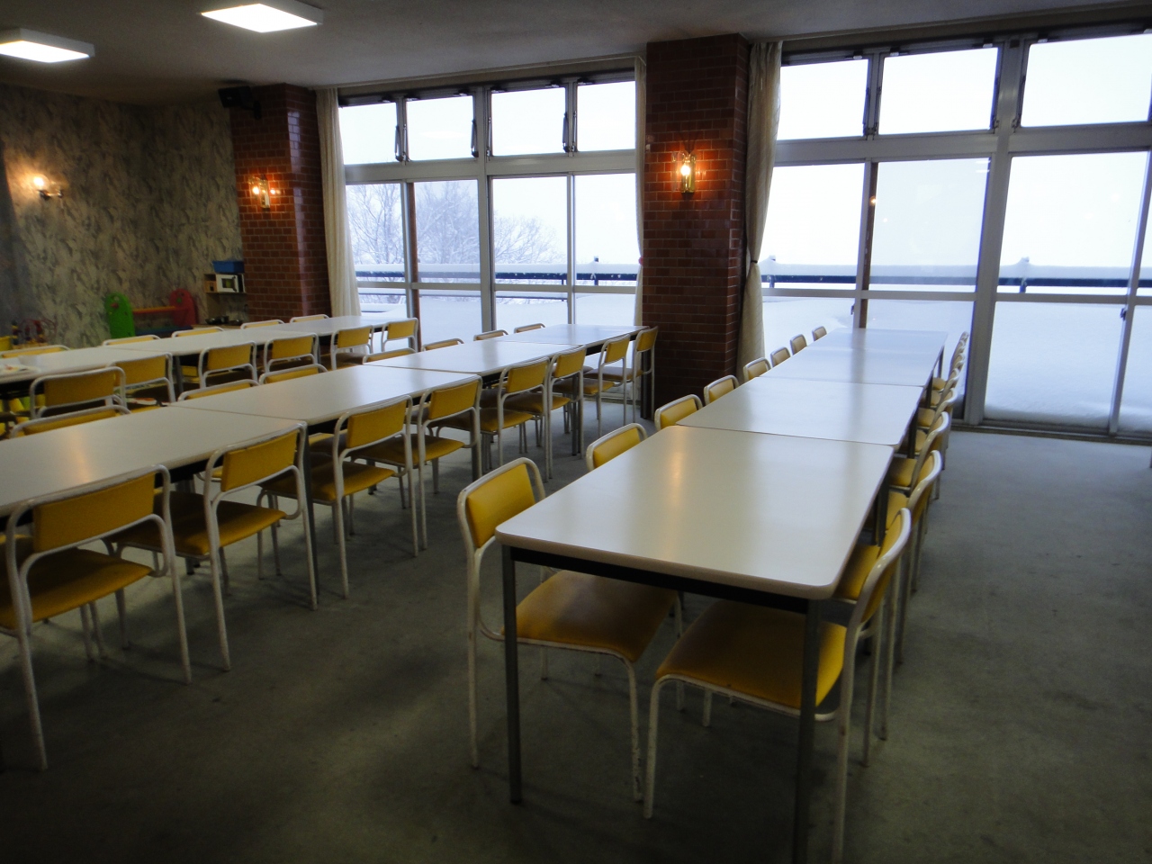 古いスキーロッジなので、冷たいコンクリート造りです。地図には国道117号に出たらあとは看板どおりと書かれていましたが、暗くなったり、雪が降っていると見えません。建物の入り口も雪の壁の中に突然あって、行き過ぎてしまいました。明るいうちに着かないと苦労します。