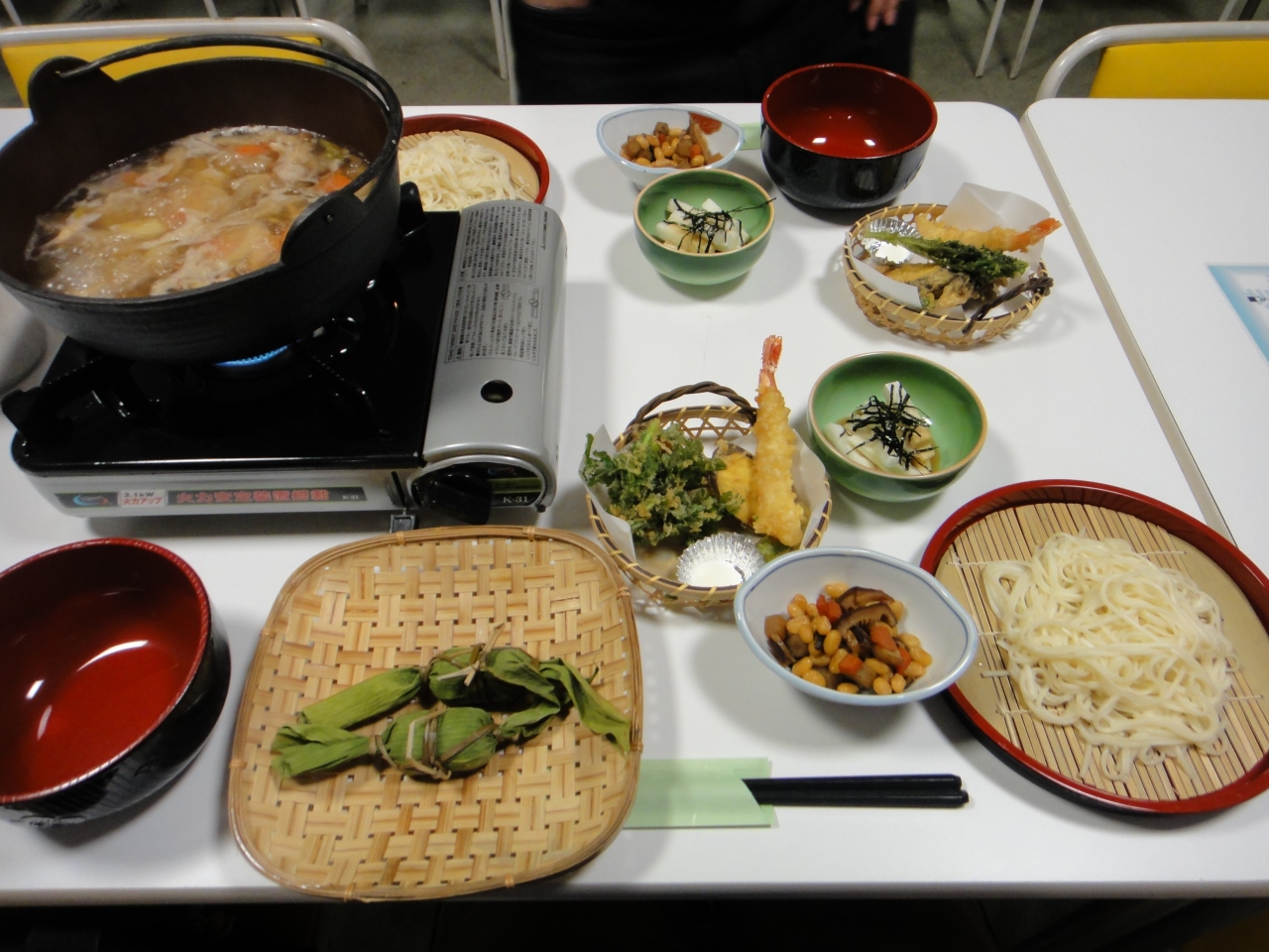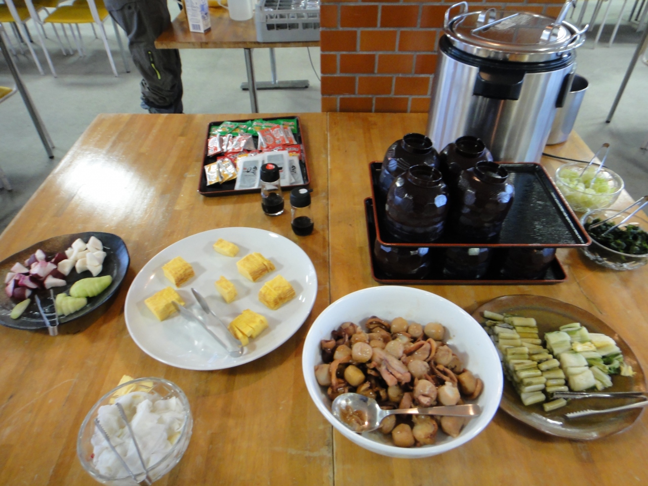 夕食は18時と18時30分に分かれて、けんちん汁の鍋がメインの食事でした。ザルに入ったうどんを鍋に入れるという説明がなく、付け汁を探してしまいました。