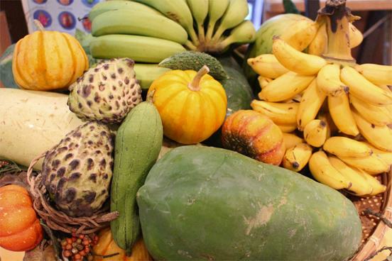 入口にフルーツを盛ったカゴがあるのですが、飾り用かと思ったら熟すと島バナナなどは1本ずつ配ってくれて楽しいです。