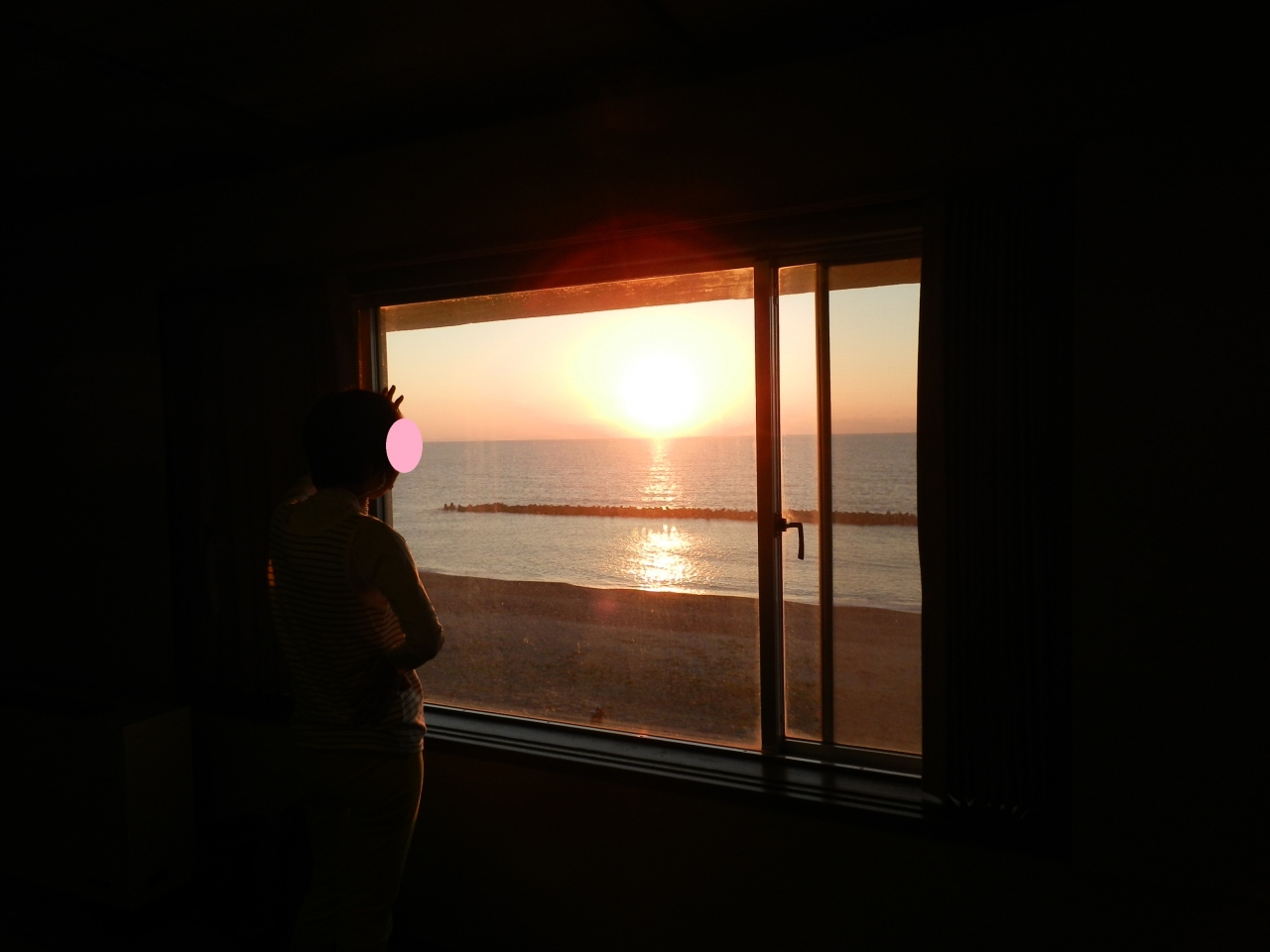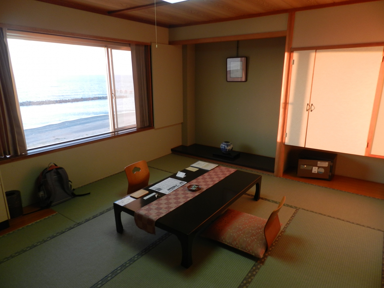 “全室オーシャンビュー、日本海に沈む夕日に染まる宿”というキャッチフレーズに惹かれて予約して、日没時刻に間に合うように早めにお宿に着いたのに…という主旨をフロントに電話したら、「和室でよろしければ空きがございます」とのことだったので、すぐに変えていただきました。