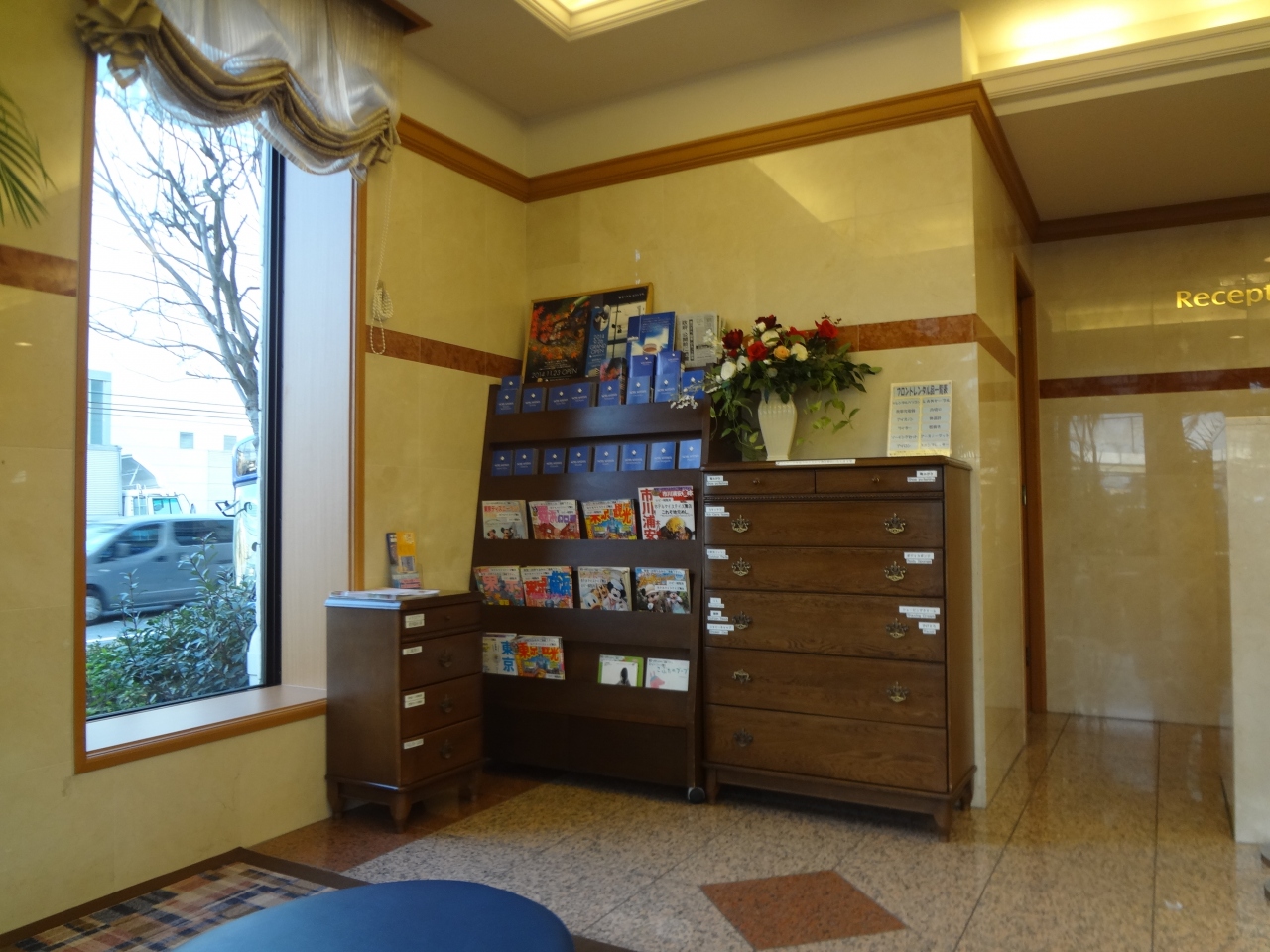 アンバサダーホテルの向こう、ディズニーシーからも近くて便利です。マンションのように外廊下なので、雨の日はちょっとつらいかも。ロビーには、ディズニー関係の本が一杯置いてあります。シャトルバスもありますが、シーには歩いて行った方が便利です。