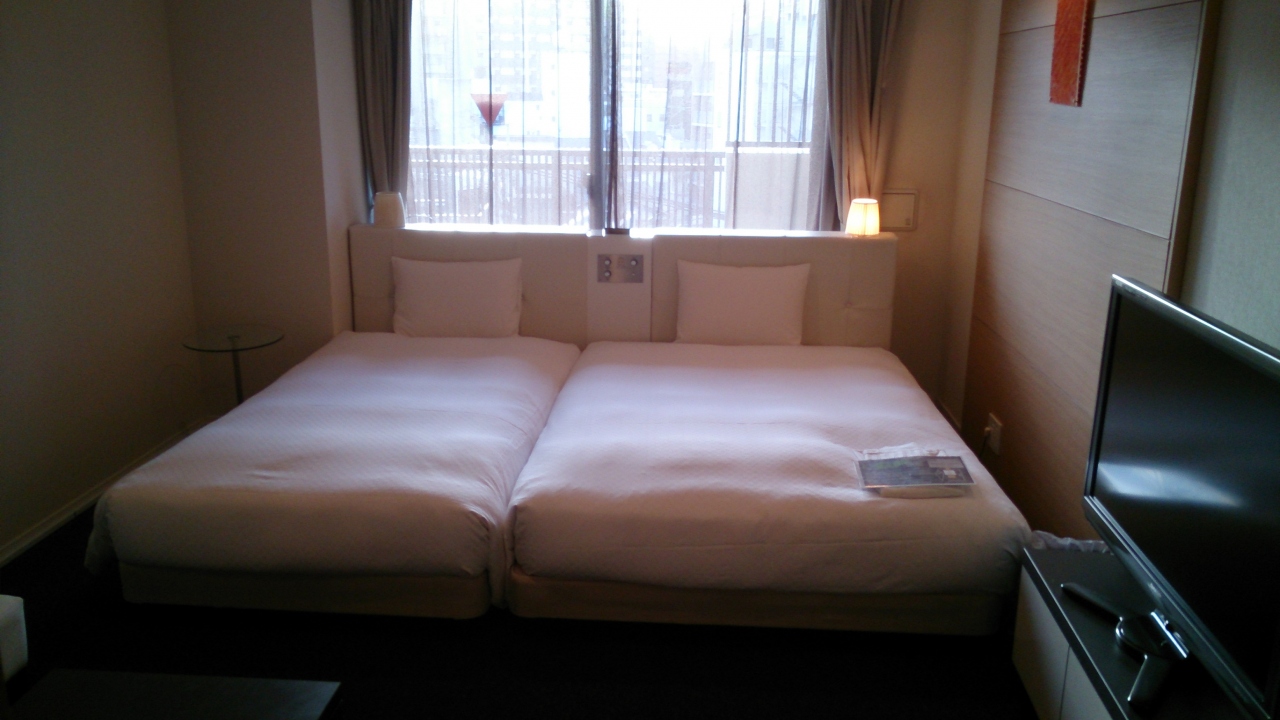 部屋が自宅みたいで落ち着きます。共有の廊下の扉と部屋の扉2か所あって廊下の音が気にならないのがいいですね。他のホテルもそうだと良いけど。食器の貸出もしてくれでデパ地下で買い物して部屋呑みしました。おもしろかったのが画像でもわかると思いますが左右のベッドの大きさが違うのが初めてでした。