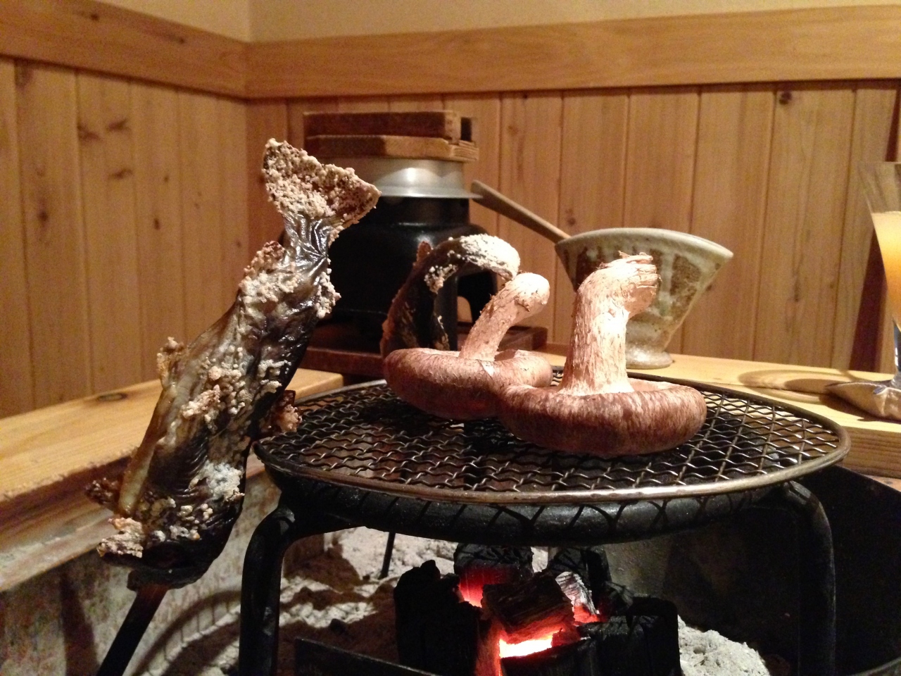 ・「山人料理+囲炉裏焼き」を選択していますが、岩魚や大振りの茸の炭焼きが美味です。