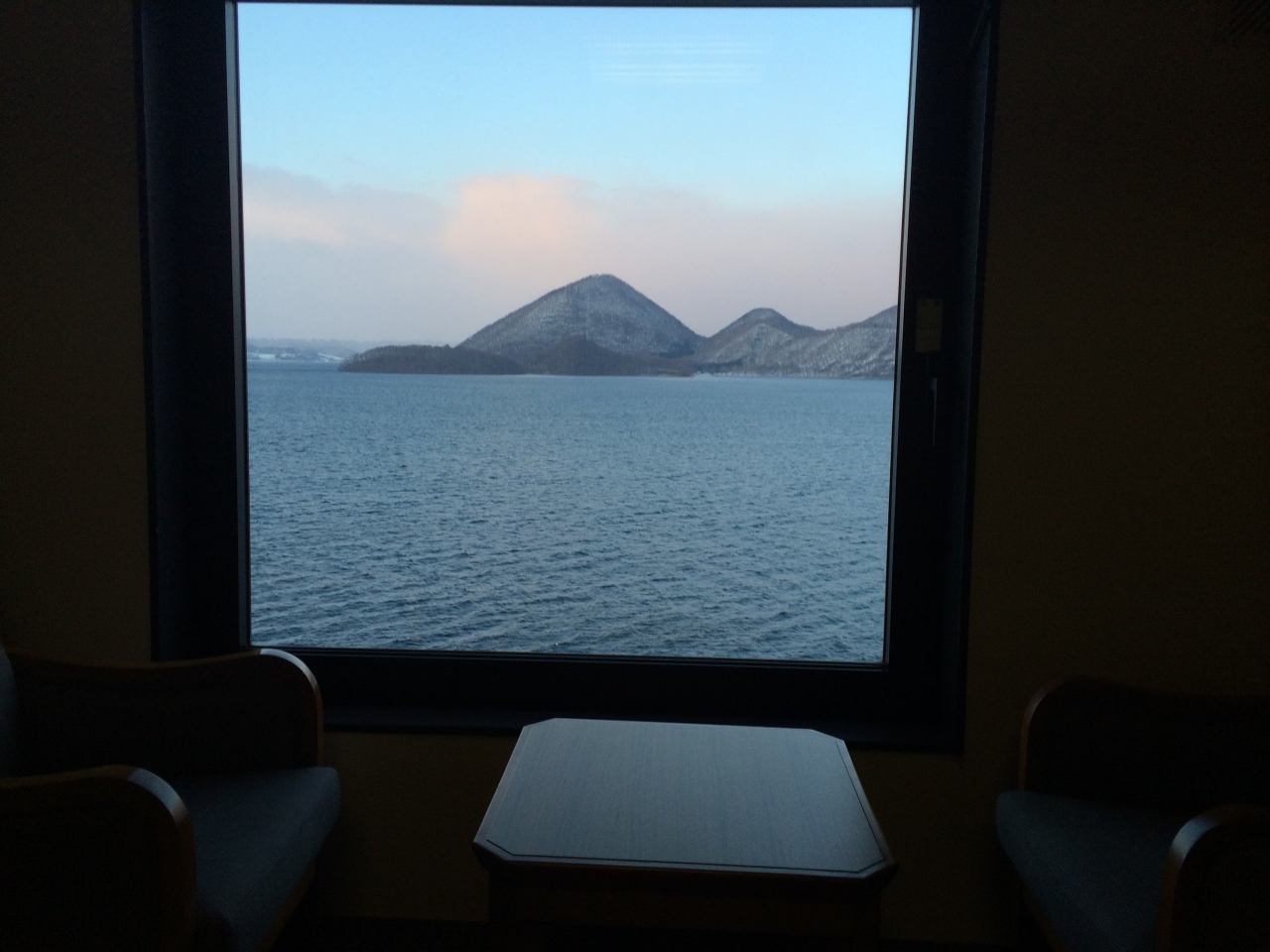 座って洞爺湖を眺めると、お風呂と湖が一体化。