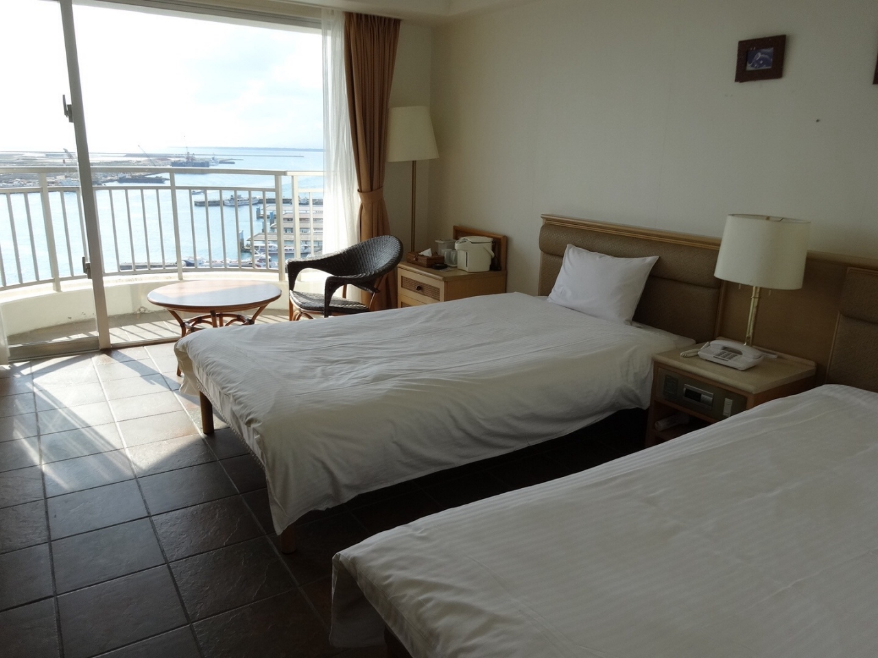 離島ターミナルに近いので離島観光に便利です。バスターミナルや繁華街にも徒歩で行けるのでレンタカーなしでも過ごせます。スタンダードツインに泊まりましたが部屋もバスルームもゆったりとしていました。テラスからの眺めもよかったですがあいにくの曇り空で夕陽はみられませんでした。朝食バイキングも十分でした。