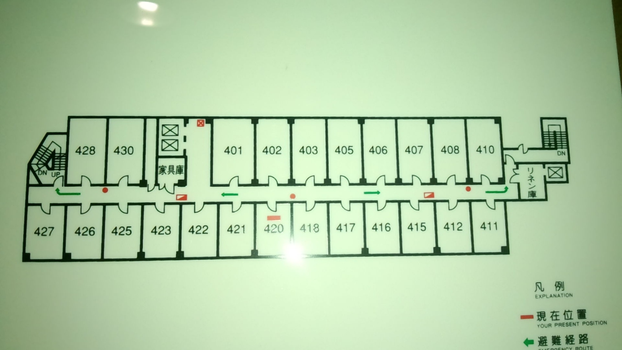 ドアの避難経路図の間取りみると、これでも小さい部屋の模様。