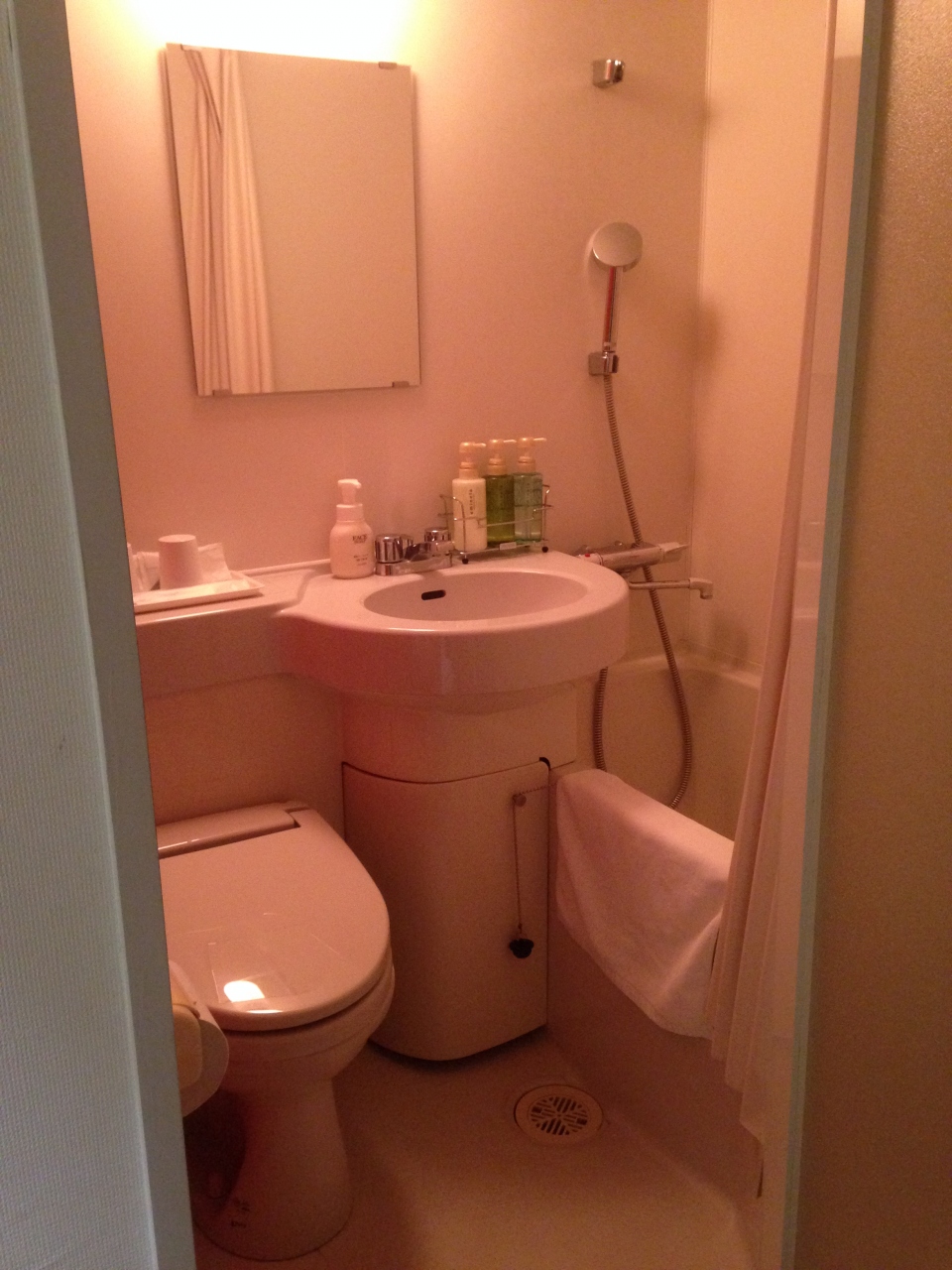 ただし、お部屋は狭くて、驚いたのはバスルームが建物の外壁側にあったことです。バスタブ、洗面台、トイレが2?ほどのスペースに重ねるように組み込まれているので、体格の大きい男性には窮屈だと思います。