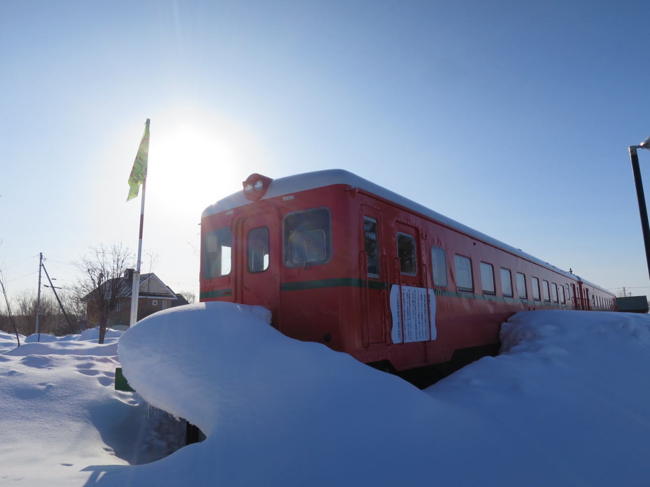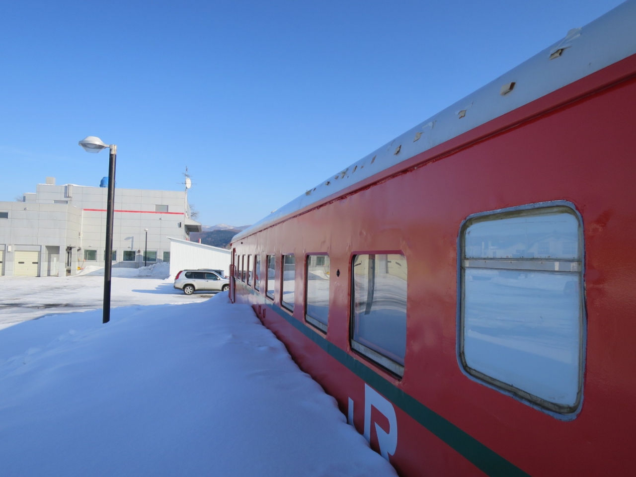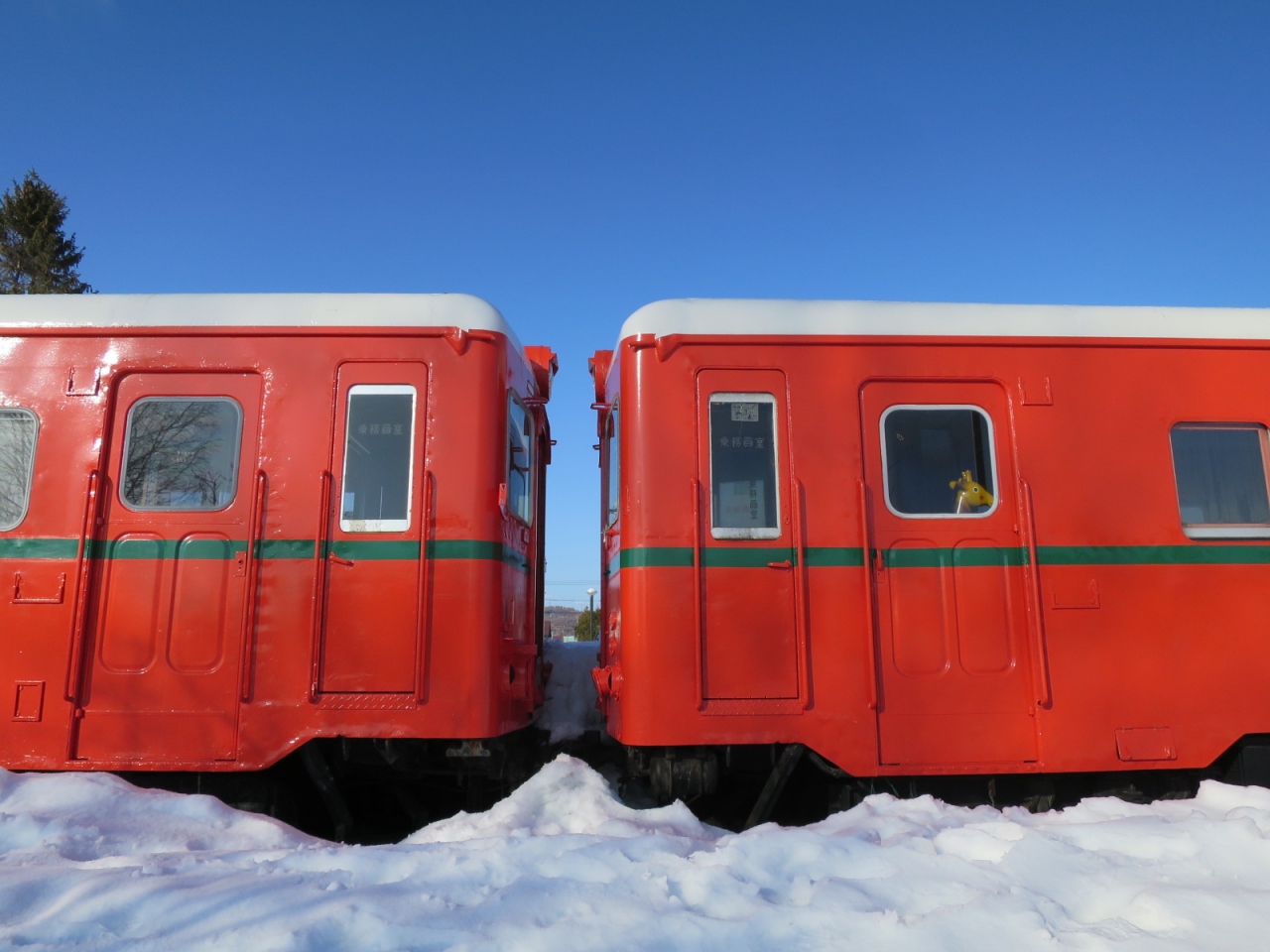 下川バスターミナル合同センターの建物の裏(西側)にあります。旧名寄本線のキハ22型気動車が2両、空き地にぽつんと置かれています。
