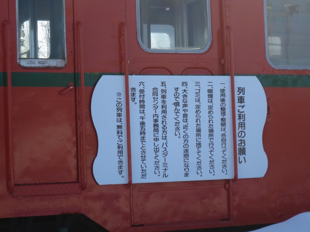 気動車の利用は無料ですが、施錠してあり、平日8時30分~19時はバスターミナル合同センターの警備員室へ連絡、それ以外の時間、土日祝日は牧村旅館(01655-4-2037)へ連絡とのことでした。(下川ふるさと興業協同組合01655-4-4206)