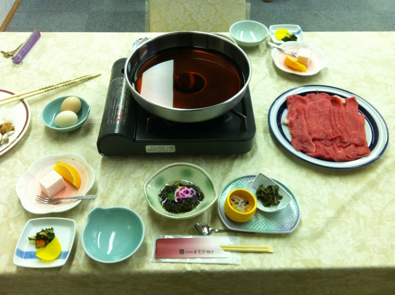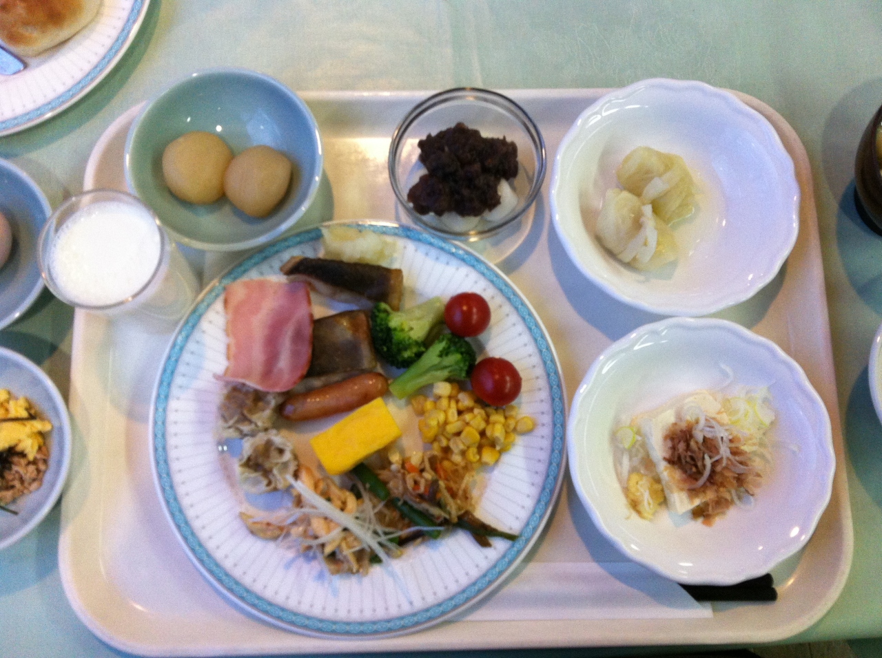 食事はインタネットの口コミを読みましたので少し期待しましたがちょっとがっかりしました。夕食はすき焼きがメインになって他には漬物、小鉢、揚げ物、茶碗蒸し、デザート、ご飯と汁です。揚げ物の魚が美味しかったです。でも、それ以外は全部普通でした。量も少なくてちょっと物足りなかったです。朝食はバイキングです。品数が多かったけど味がいまいちでした。一番気に入った”料理“が白玉とつぶあんのデザートです。しかし、たぶん手作りではなく市販品です。
