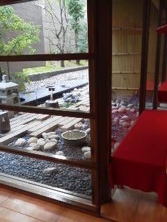 まず、ビジネスですが広々としたロビーにちょっと感動。アロマの香り漂う感じのいい場所です。小さな中庭が見えて、京都らしい演出。