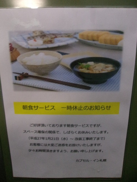 今回も再び、1100円の激安プランにて宿泊しました。ただ、現在2014年末から続いている改装工事がまだ続いていて、1Fの朝食会場で提供されていた通常の朝食サービスは休止状態になっていて、代わりにお弁当での提供となっていました。このお弁当はちょっと量が少ないので、早く通常の朝食サービスが復活すると嬉しいなと感じました。尚、コインランドリースペースが広くなっていて、洗濯機や乾燥機の設置台数が増えていました。